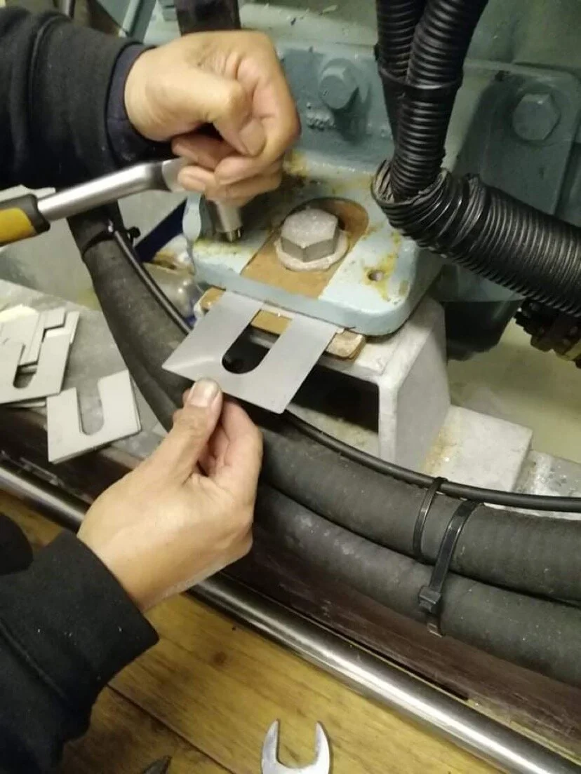 Being that the engine was hard mounted, we had some custom shims lazer cut. We slipped them under the engine mounts until we measured that the drive-line was running true.